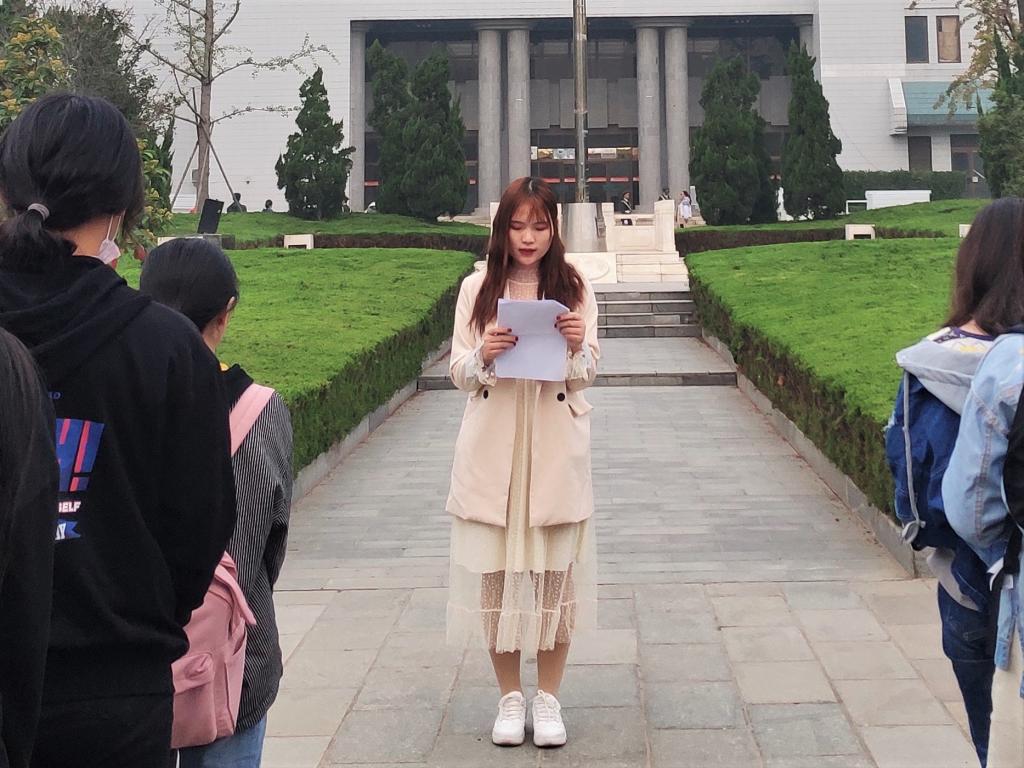丰子娴以打造新时代“大国重器”的工业人引入,回顾了国庆节阅兵时激动人心的历史时刻,抒发了对祖国发展的由衷赞美与感慨。今年还是五四运动一百周年,她缅怀了革命先烈的丰功伟绩,并鼓励同学们奋发图强,用切实的行动践行“明德新民,止于至善”的校训,做新时代优秀的“河大人”。余瑞以自身经历为线索,从生活中具体鲜活的事例着手,抒发了自己作为中国人的自豪感。她提醒同学们要深刻把握时代的历史定位,深刻认识主要矛盾的历史变化,立足实际,实事求是,不忘初心,高举旗帜,切实贯彻落实十九大会议精神,努力创造更加美好的未来。