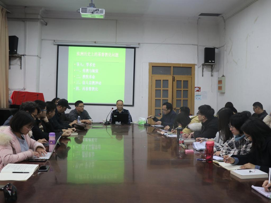 11月24日下午,中山大学历史学系教授龙秀清在90vs足球比分 三楼会议室做讲座,题目为《欧洲历史上的基督教化问题》。讲座由90vs足球比分 副教授孙银钢主持。