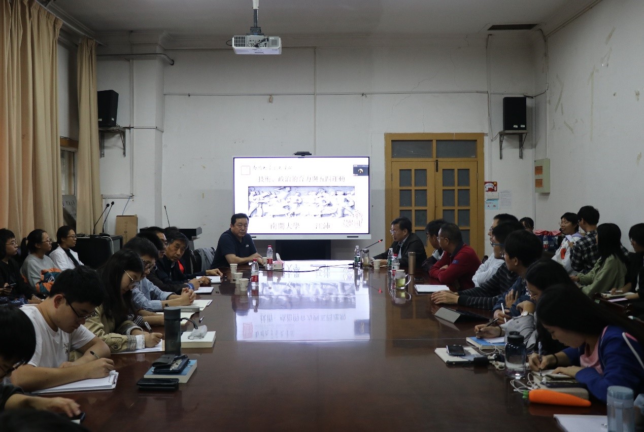江沛主要从技术、经济利益与政治纷争等方面来研究五四运动的爆发。他首先结合疫情期间的网络授课来展示互联网与学术研究的关系,进一步强调历史学必须关注技术发展与时代变革的关系。他讲到,技术进步推动了知识与信息的传播,达到了动员群众的效果,从而增强了民族凝聚力,在一定程度上也促进民众的知识、政治平等,为群众性运动奠定了基础。紧接着,江沛分析了参与助推五四抗议运动的诸种政治势力,指出其意在推动形成配合政争的舆论力量。他介绍危机之际的民族企业产品,分析了工人、工商业者参与五四抗议运动的原因。江沛对直皖战前的宣传战进行讲解,梳理了政治党派纠纷对五四运动的影响。最后他总结到,五四抗议运动是诸种因素的复合体,也是一个特殊时代的产物。同时给出三点启示,即重视历史中技术与经济的作用、重视中国近代史的全球化视野、重视历史的复杂性。在互动环节中,江沛与同学们进行了热烈的讨论与交流。