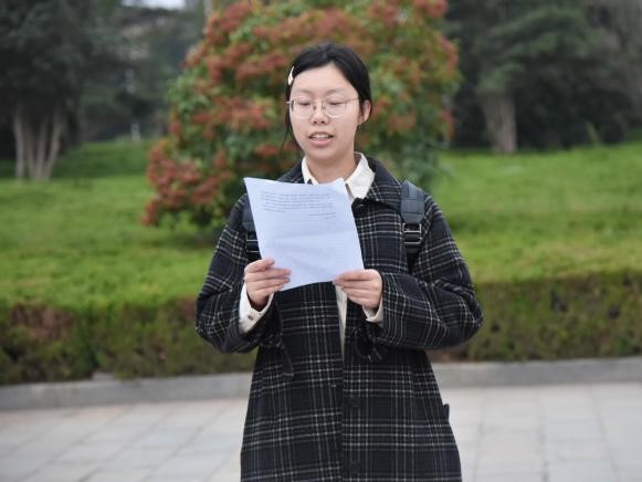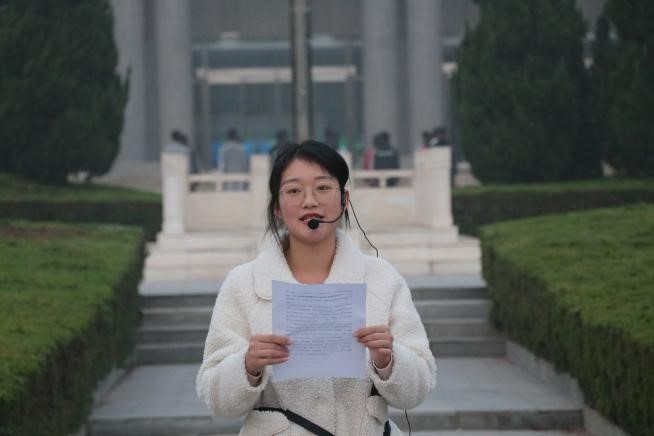 团委副书记郑振亚发言。他表示,国旗是新中国的象征,国歌是最激越的旋律,现如今幸福祥和的生活正是英雄前辈浴血奋战的结果。他强调,祖国取得的辉煌成就来之不易,作为河大学子,在中华民族伟大复兴的征程中,应当用实际行动书写当代大学生的正确价值观,为祖国的发展贡献青春力量。2020级世界史专业学生代表文曲星作国旗下演讲。她举出独龙族的实例,阐明了中国共产党始终秉持“一个民族都不能少”的原则,带领各少数民族不断发展迈向小康的初心,河大学子作为新时代青年,更应传承百折不挠、自强不息的精神,为实现中华民族的伟大复兴而拼搏奋斗。