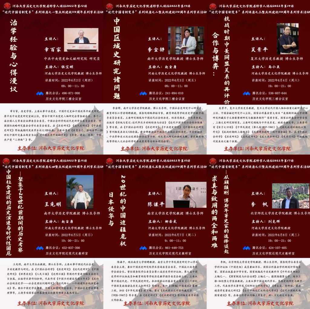 学术结构。本次“近代中国省制变革”系列讲座从不同主题、不同角度、不同方面针对一系列重要学术问题进行探索,内容详实,深入浅出,气氛活跃,除河南大学师生积极参加外,还有许多其他高校的师生也踊跃在线参加,产生了良好的学术效果及影响,本次系列讲座取得圆满成功。