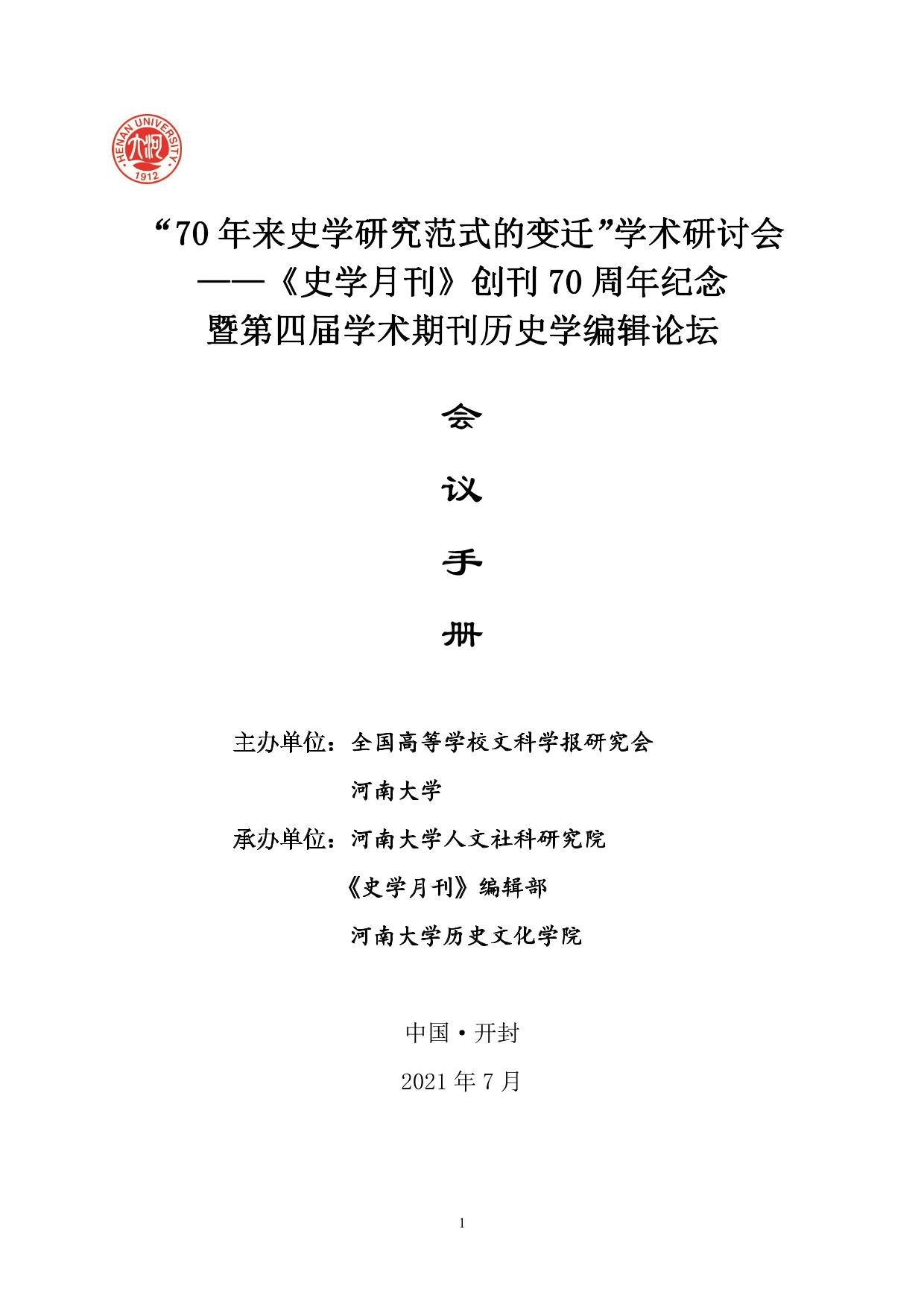 【学术会议】“70年来史学研究范式的变迁”学术研讨会——《史学月刊》创刊70周年纪念 暨第四届学术期刊历史学编辑论坛议程