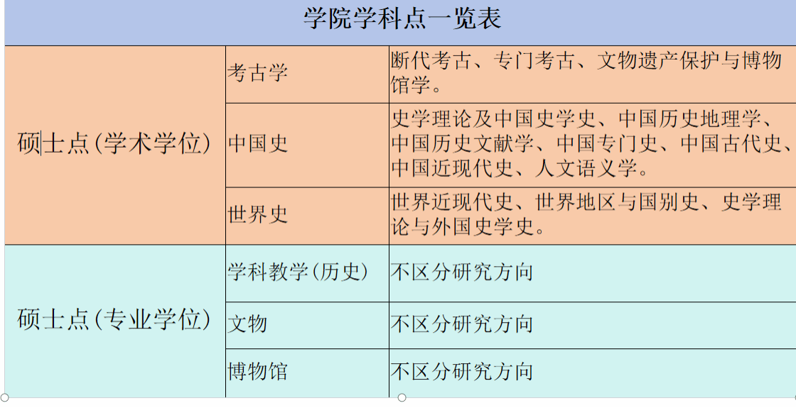 目前有考古学、中国史、世界史三个一级学科博士、硕士学位授权点及博士后科研流动站,学科教学(历史)、文物、博物馆三个专业硕士学位授权点。