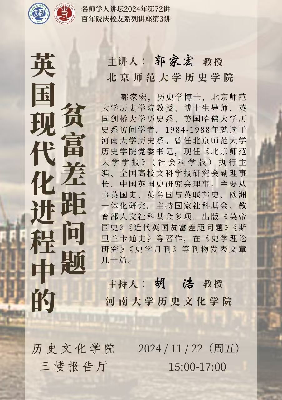 【讲座预告】百年院庆校友系列讲座第3讲|郭家宏:英国现代化进程中的贫富差距问题