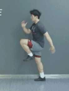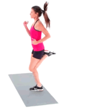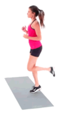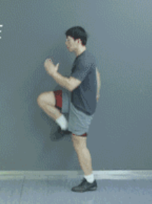 保持上身挺直,两大腿交替上抬,小腿下垂,大腿上抬高度至少保持水平面以上,双臂同肩宽,与腿一起摆动。