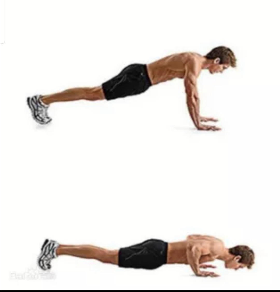 双手支撑身体,双臂垂直于地面,两腿向身体后方伸展,依靠双手和两个脚的脚尖保持平衡,保持头、脖子、后背、臀部以及双腿在一条直线上动作重点:全身挺直,平起平落。