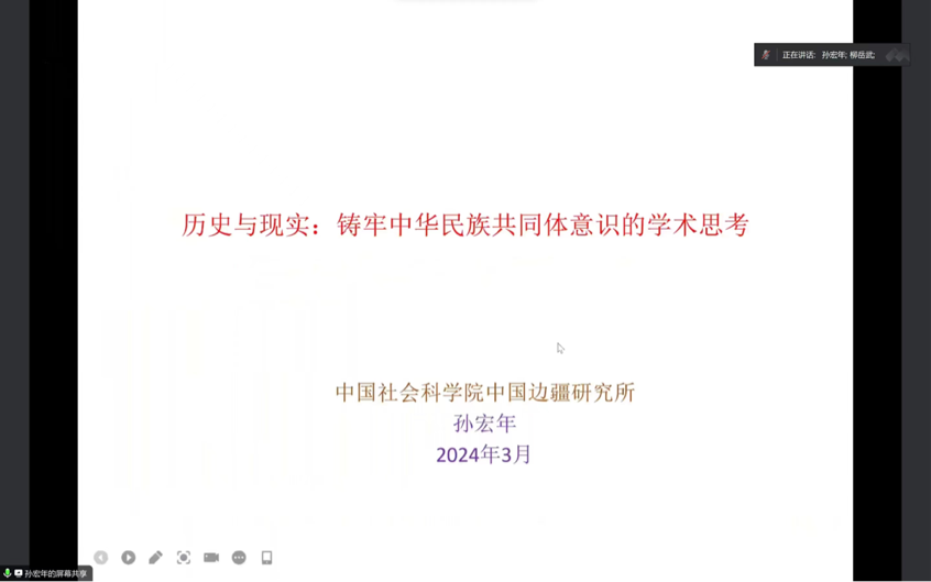 在学术讲座中,孙宏年梳理千百年来中华民族共同开拓辽阔疆域,创造璀璨文明,形成中华民族共同体的历史脉络,围绕铸牢中华民族共同体意识提出学术思考。讲座第一部分重点阐述了铸牢中华民族共同体意识的历史逻辑:千百年来中华民族共同开拓祖国的辽阔疆域,在守护神圣国土的百年抗争中实现了中华民族的伟大转变,逐步形成中华民族多元一体格局。通过探究历史上中华民族疆域的开拓奠基过程,他认为“中国历史疆域”与中华民族共同体的形成具有四个特点:首先,统一是大趋势,分立时期同样酝酿着新的统一;其次,中国的历史疆域是由多民族共同开拓缔造的,中华民族多元一体的格局在中国疆域形成、发展过程中逐步形成;第三,文化认同是基础,中华文明的传播对于中国历史疆域产生重要影响,文化认同是中国历史疆域巩固、发展的“精神凝聚力”,也是各民族、部族维护国家统一、逐步形成中华民族共同体的心理基础;第四,疆界并存,中国疆域形成过程中“疆”“界”并存。讲座第二部分从当代实践角度,阐述了各族人民休戚与共、荣辱与共、生死与共、命运与共,共同守护、建设边疆民族地区,讲述了当代“戍边人”“进藏先遣连”“国家的孩子”“五湖四海聚新疆”等多个案例。最后,讲座从历史研究工作者的使命出发,呼吁学界发扬学术研究“经世致用”的优良传统,以高水平的成果为铸牢中华民族共同体意识贡献历史智慧和学术力量。与谈人马维熙、贺怀锴老师等对该讲座予以高度评价,并且鼓励师生们进一步做关于中华民族共同体问题的深度研究。