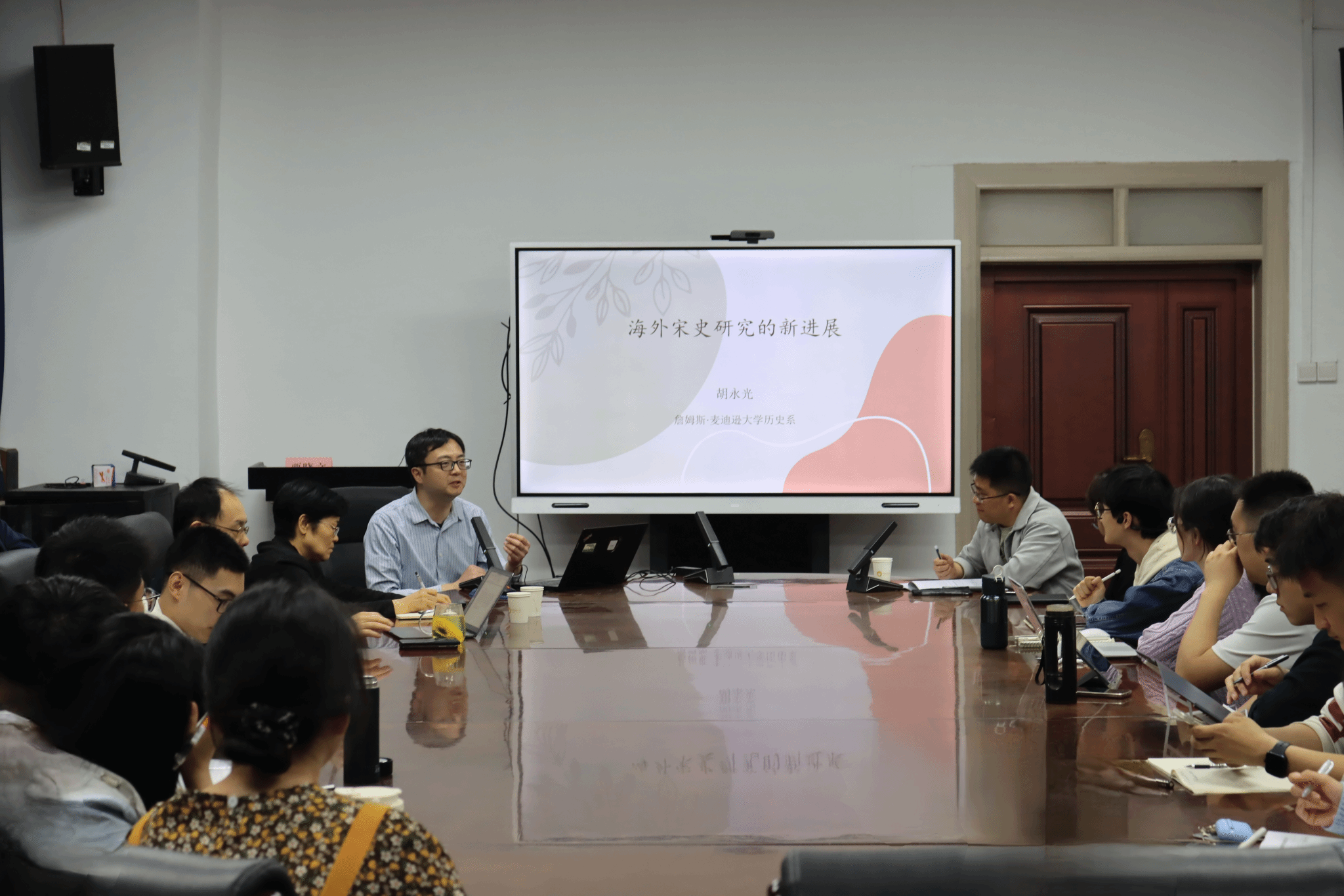 胡永光首先回顾早期海外宋史研究历程:柯睿格最早对宋代科举进行研究,论证科举对社会流动性的促进作用,但柯睿格的理论在美国学界不被认可。在美国宋史学界,地方主义理论占主流。郝若贝通过对比北宋职业官僚与南宋地方精英,指出科举制下的文官政治被豪门大族所控制。韩明士通过研究抚州士人以及对比地方精英与国家,认为所谓的社会流动性是不存在的,真正提出了精英地方化理论。紧接着,胡永光介绍了其他重要美国宋史学者,如刘子健、包弼德、伊沛霞、田浩、贾志扬、柏文莉、蔡涵墨等人,他表示,海外宋史研究的成果主要集中在文化、思想、商业活动、社会家庭关系的变迁;地方主义、国家与地方精英之间的复杂关系;宋与非汉族政权的关系以及史学理论的运用等方面。胡永光讲到,北美宋史在史学史脉络上极具特色,经历政治史、社会经济史,再到文化史转向,其后则聚焦于全球史、科技史、数字史与公众史等。在研究方法层面,呈现出语言能力受限、偏重二手资料及聚焦当下理论等特点。随后,胡永光对过去十年北美中国史博士论文数据进行统计分析,并列举了文欣、左娅、程晓文、陈松、马瑞诗等新一代学者及其著作。最后,胡永光对美国历史研究进行未来展望,他认为其机遇在于数字技术与人工智能、公众史学、全球史的新课题;困难则在于大学入学人数、外语教育、研究经费和政治因素等。