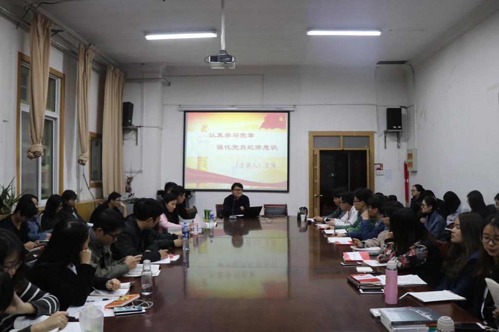 1110日晚,90vs足球比分 第二期“青马班”暨党课在三楼报告厅进行,90vs足球比分 党办主任王闯为入党积极分子和学生骨干讲授了以“认真学习党章,强化党员纪律意识”为主题的党课。