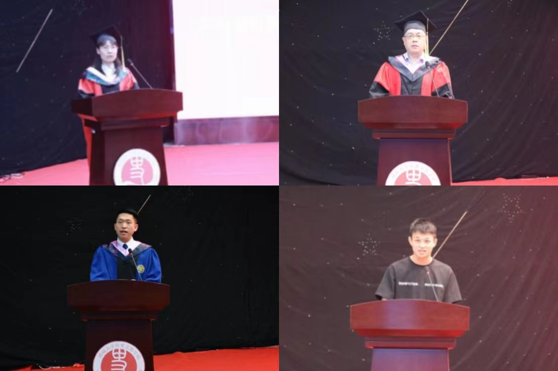 王煜皓代表全体毕业生发言,在“路途有荆棘险阻,尽头有千山四方”中回忆三年光阴,在“回望来时路不忘初心,展望未来途前程可期”中畅想青春。滑翔代表在校生发言,回忆与学长学姐共渡的难忘时刻,感谢他们在科研、学习、生活、实践上无微不至的关怀与指导,祝愿学长学姐们毕业快乐,前程似锦。