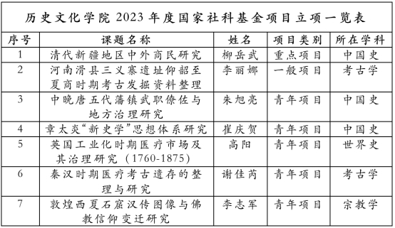 共获批7项,立项数并列全校第一。其中重点项目1项,一般项目1项,青年项目5项,涵盖中国史、世界史、考古学、宗教学等4个学科,展现了90vs足球比分