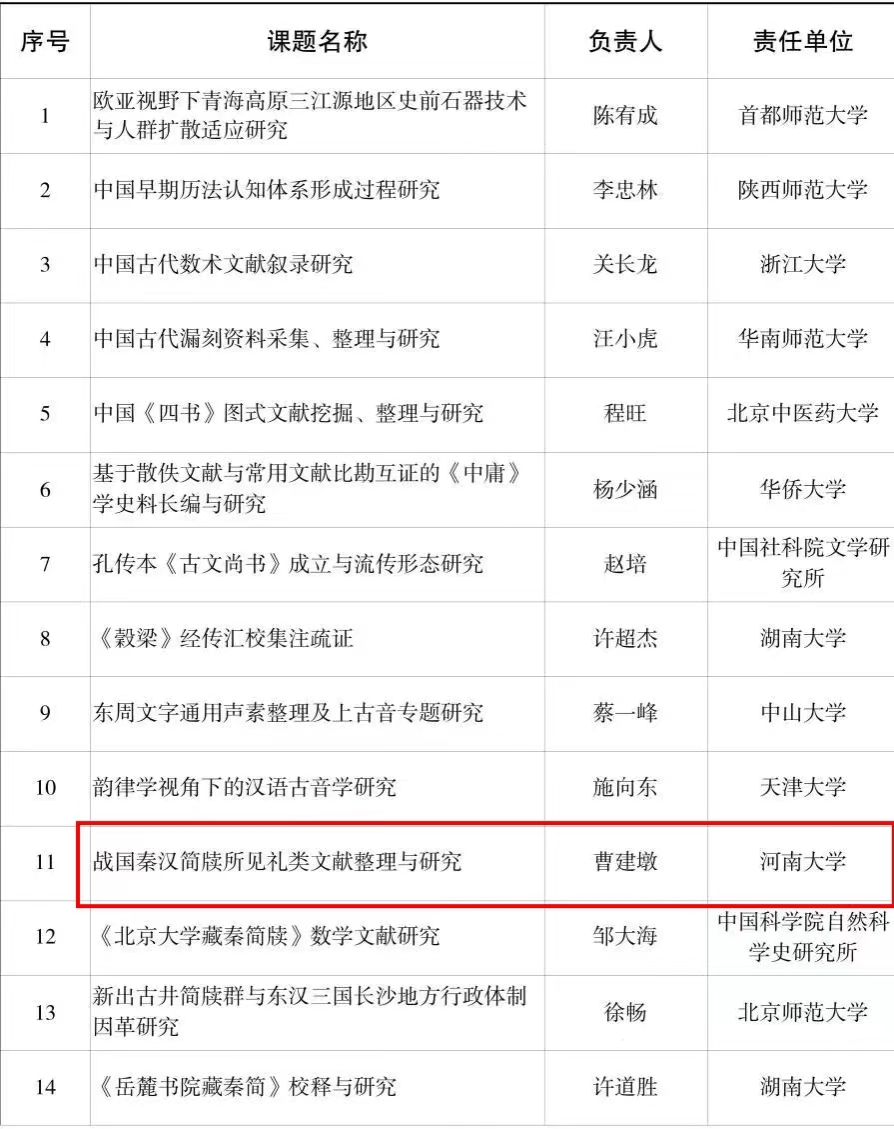 曹建墩教授申报的“战国秦汉简牍所见礼类文献整理与研究”获个人项目立项,也是今年我校唯一获批的“冷门绝学”研究专项。