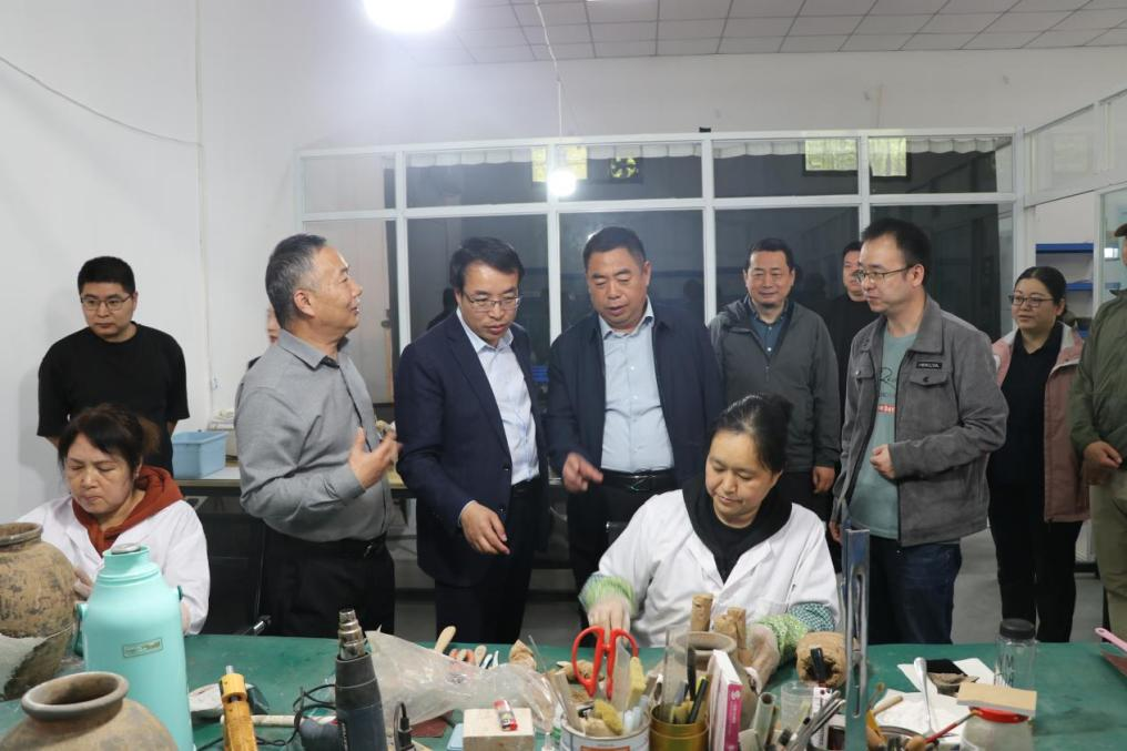 一行首先来到联合考古基地发掘现场进行调研。李溯源介绍了基地目前进行考古项目的基本情况、队伍构成、工作进展、安全保卫等工作,并重点汇报了春秋战国时期车马坑等已有发现成果和下一步发掘计划。