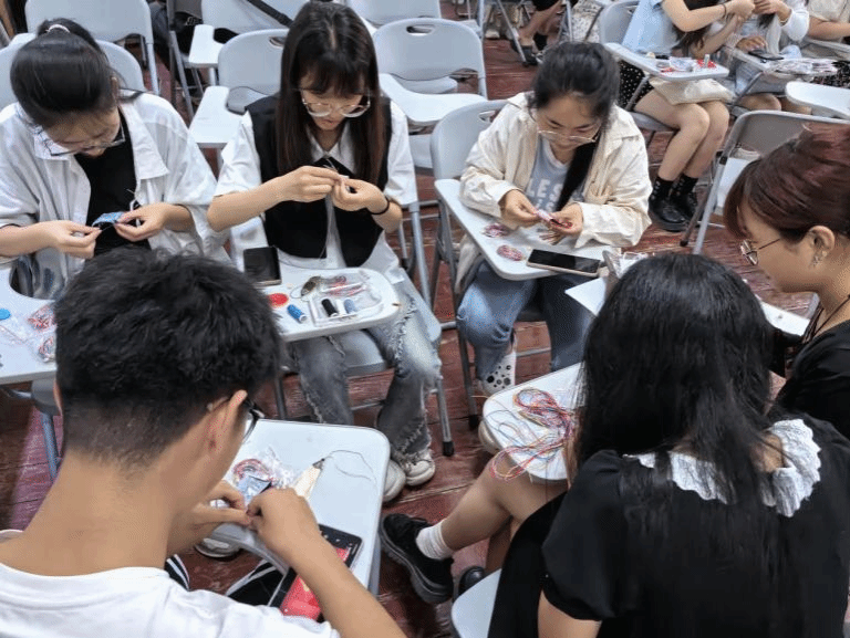 活动设置了传统手工制作、传统习俗问答、诗词抢答和弘扬中华优秀传统文化思政小课等环节。“彩线轻缠红玉臂,小符斜挂绿云鬟。佳人相见一千年。”同学们在现场团结合作,互相指导,观看制作视频学习方法,动手实践。端午佳节编织五彩绳具有吉祥如意,驱邪避灾,幸福美满,健康长寿,保护儿童等美好寓意。包香囊是端午节必不可少的习俗之一,活动现场准备了艾草作为香料,流苏配饰,香囊布料,同学们一针一线地缝制起来,虽手法生疏,但热情和专注不减。针织香囊作为一种古老的技艺,它穿越时空的隧道,将埋于以艾草为填充物的香囊中所蕴含的驱邪避疫,缅怀屈原的情感传递给人们,展现出无尽的美感和温度。在随后的知识问答,诗词抢答环节,同学们以丰富的学识和极快的临场反应能力踊跃参加,现场充满了既紧张又热烈的氛围。