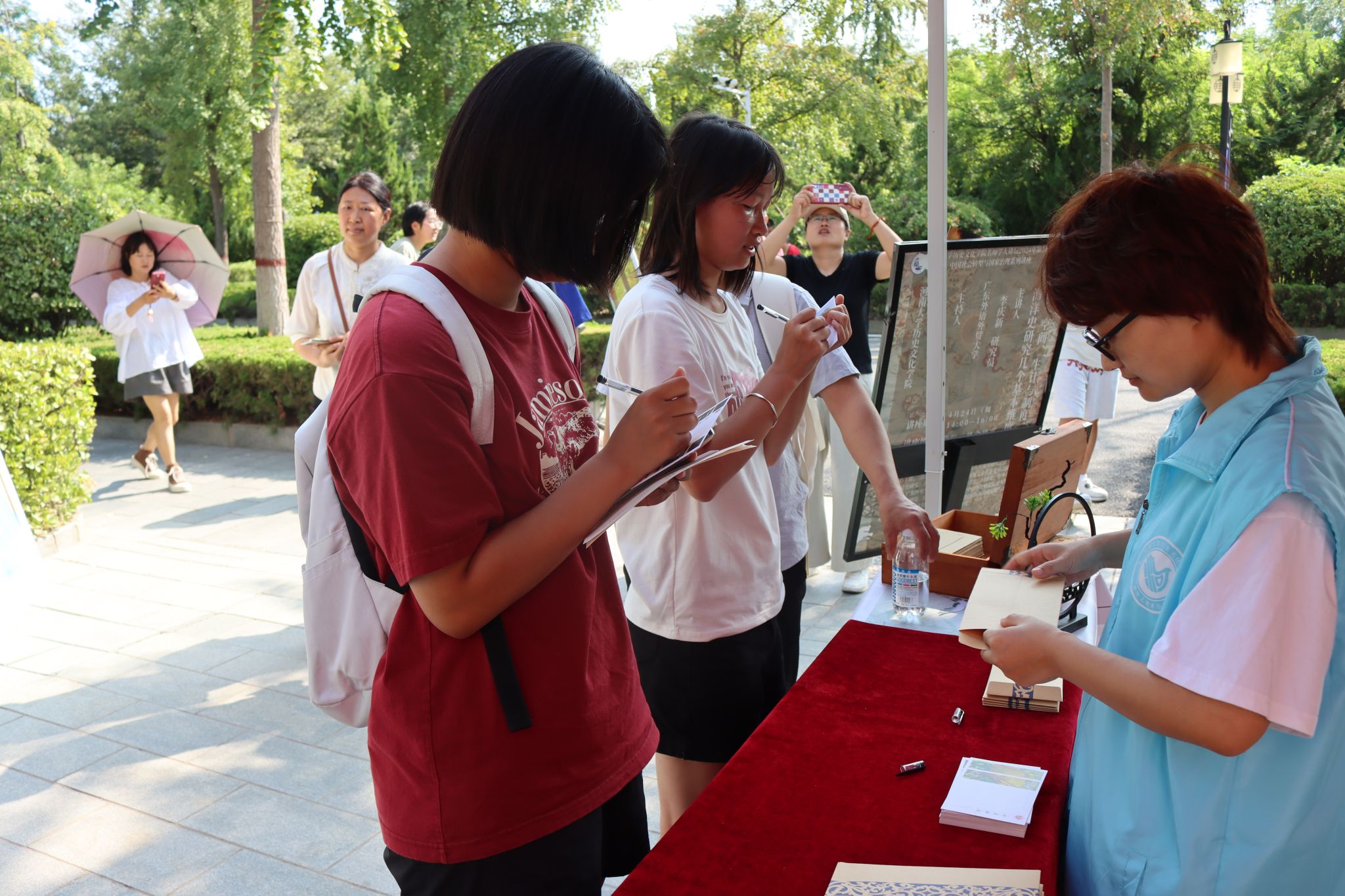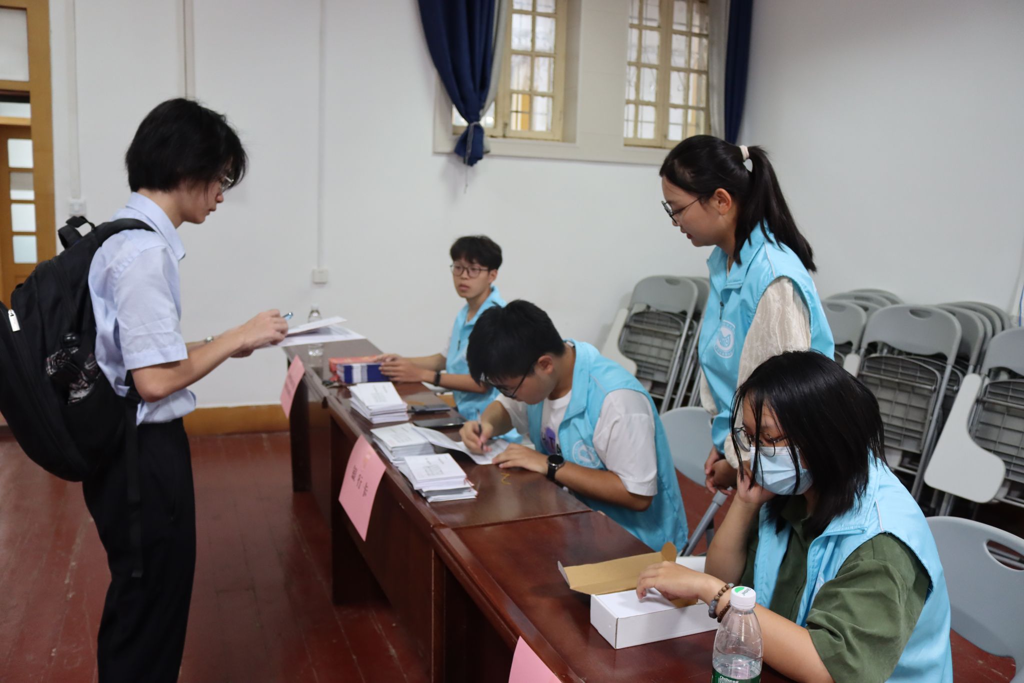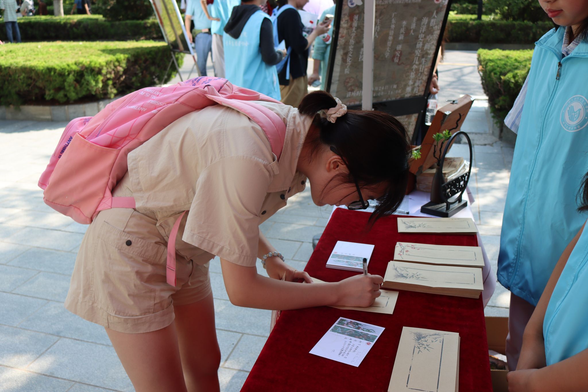 门前,同学们首先体验了本次迎新的特别活动——时光邮局,他们认真在明信片上写下对四年后的自己想说的话,再将它们用信封装好,由志愿者帮忙放回“信箱”中,静待四年后的花开。