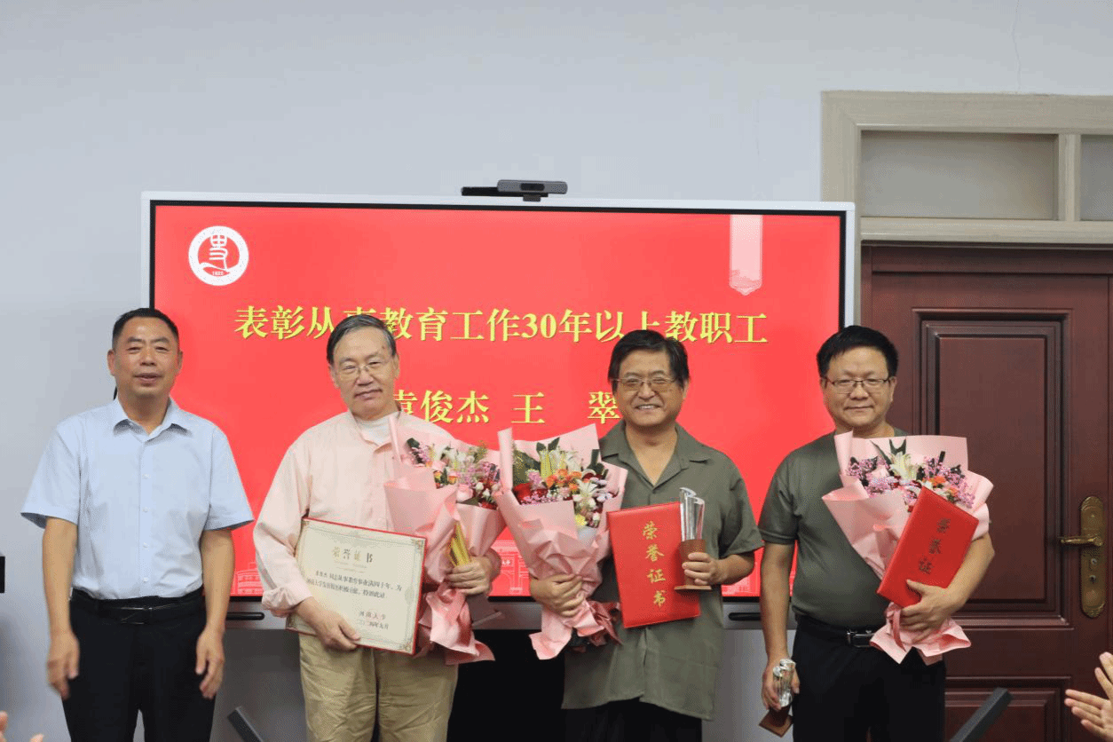 新增从教满40年的袁俊杰、王翠和新增从教满30年的张立东、邱胜利老师颁发证书和奖杯。