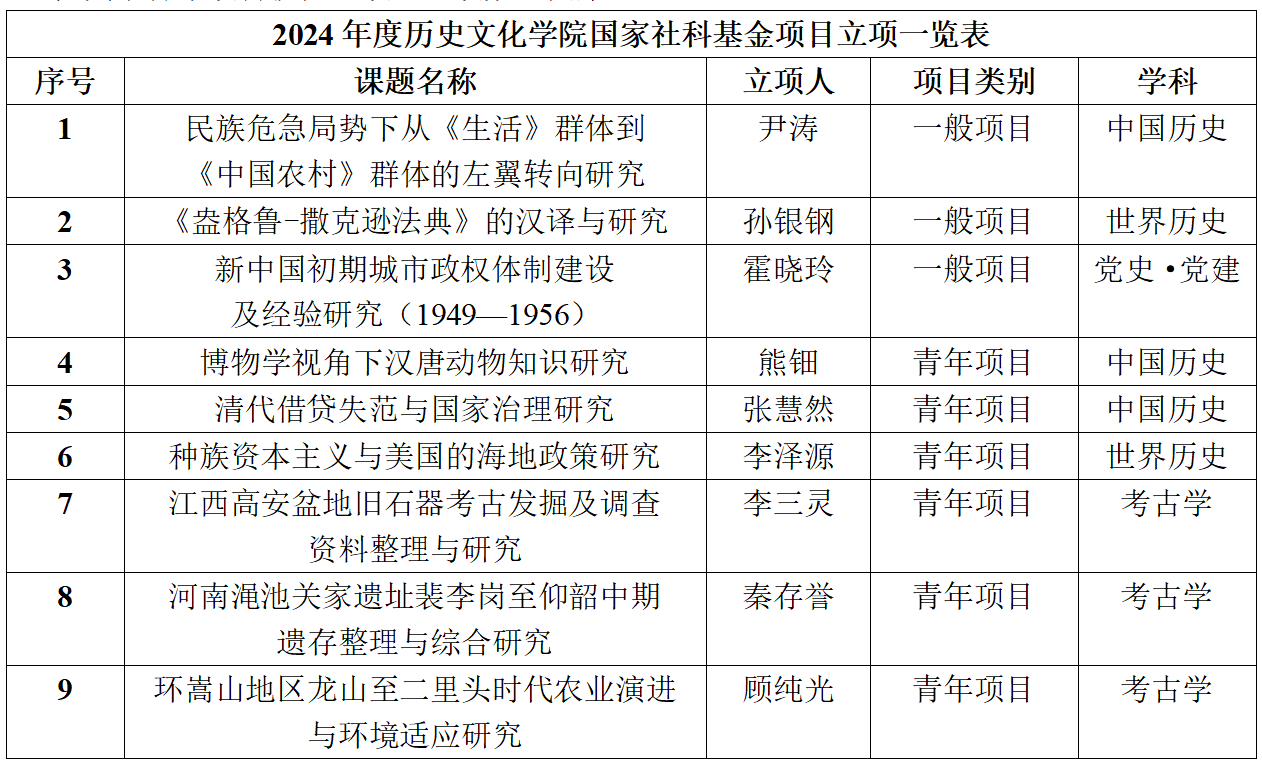 共获批9项,包括一般项目3项,青年项目6项,涵盖中国史、世界史、考古学、党史·党建等4个学科,立项数居全校第一。另外河南大学历史学类国家社科基金项目共获批11项,立项数全国并列第一;其中青年项目获批8项,立项数全国第二。