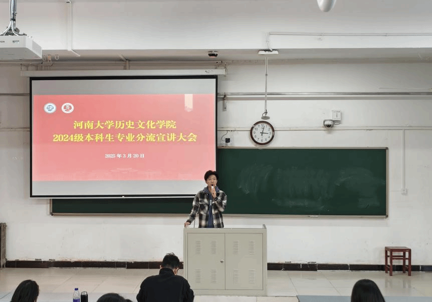 会议伊始,田管宁简要介绍专业分流背景,他表示,专业分流的意在适应社会需求,激发学生学习的主动性、自觉性和创造性,严格遵循公平、公正、志愿和择优的原则,更好地为社会培养人才。此后,各专业的宣讲老师分别围绕培养目标、师资队伍、课程安排、平台支持、升学就业等方面详细介绍本专业概况。中国古代史教研室主任武波着重讲解历史学积淀深厚的专业背景,近百年的历史积淀,造就了历史学专业中西交融、古今贯通的学术传统,在国内外发挥着稳定而深厚的影响。考古文博系副主任李雯雯介绍文物与博物馆专业情况,文博专业课程体系完备,特色优势明显,河南位于黄河中游、中原腹地,文物遗产资源丰富、博物馆数量众多,文物承载着地域、民族、国家丰厚的历史文化,文博资源是爱国知国、爱家知家的动力源泉。考古文博系党支部书记、副主任张玲认为考古学是一个富有魅力的学科,也是一门国际性的学科,河南大学考古学发端于1931年文史系学生尹达、石璋如等参与殷墟第四次发掘,考古学专业培养目标是具备田野考古发掘、考古学研究能力的高素质人才。世界史系主任、党支部书记杨磊介绍“明德计划”世界史实验班情况,世界史专业施行小班教学,由专业老师一对一指导学生学习与论文写作等,采用“专业+语言+文化的培养模式”,同以色列、英国、美国等国高校及科研机构建立起长期合作关系,具有良好的发展前景与潜力。教务办公室主任张芳芳向学生讲解历史学类大类招生、专业分流、本科生导师制的实施办法,她建议同学们要以兴趣为导向,摆正心态,杜绝盲目跟从之风。