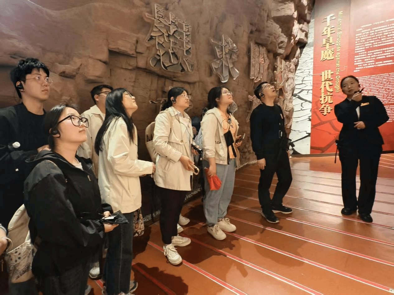 在红旗渠纪念馆内,师生们通过全景沙盘、历史影像和万余件文物,系统回顾了林州人民“劈开太行引漳水”的壮举。动态还原的“凌空除险”“铁姑娘打钎”场景,配合陈列的钢钎、手推车等工具,生动展现了10万建设者削山凿洞的艰辛历程。实地考察与现场授课相结合,同学们更加深刻认识到红旗渠不仅是水利奇迹,更是一部生态抗争史。它体现了先民面对恶劣自然环境时的智慧与韧性,为当代生态治理提供了历史镜鉴。