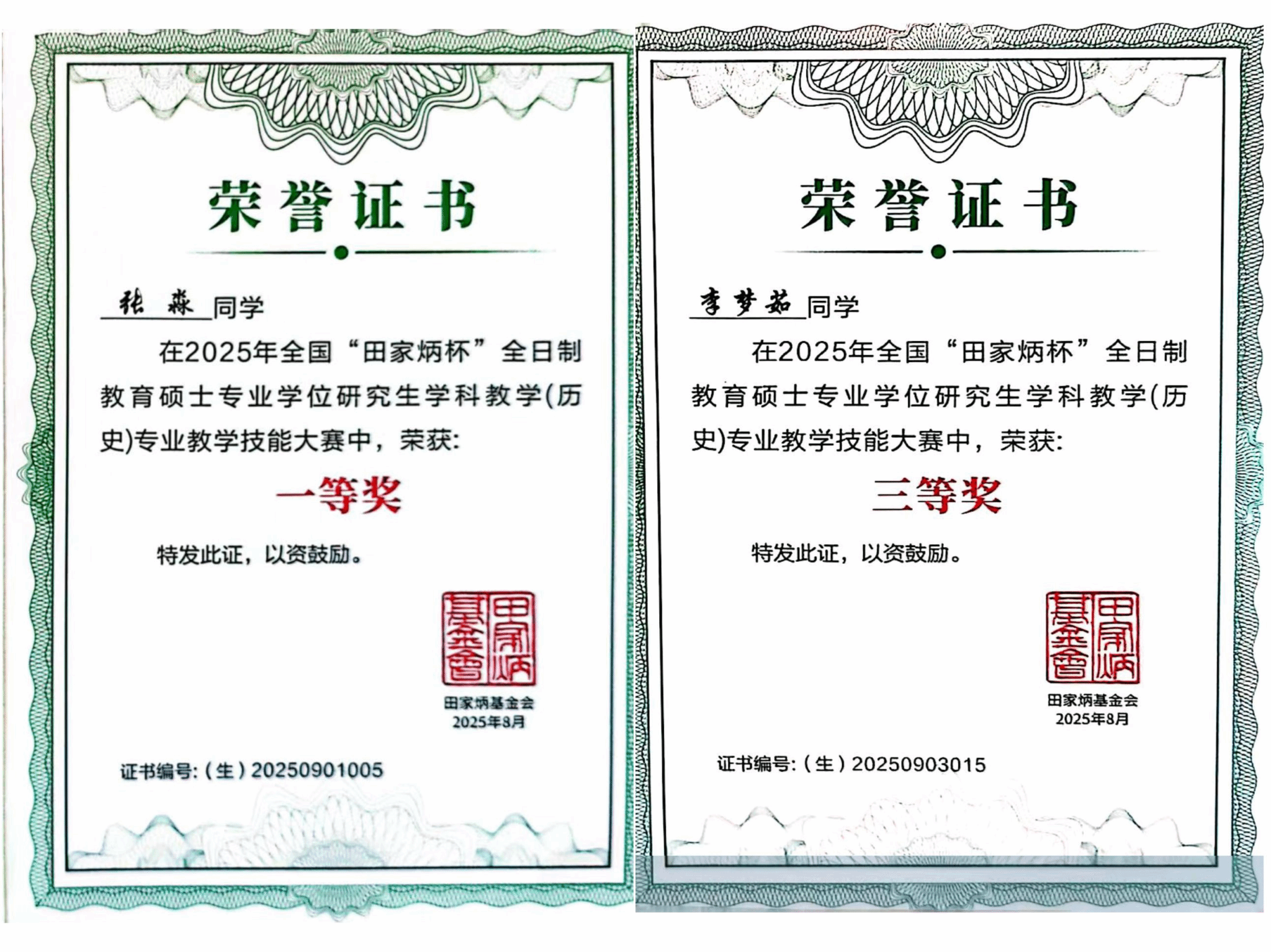 2023级与2024级学科教学(历史)专业硕士研究生张淼、李梦茹分别斩获一等奖及“优秀教学设计奖”、三等奖及“优秀教学设计奖”,指导教师黄俊华荣获“优秀指导教师奖”。