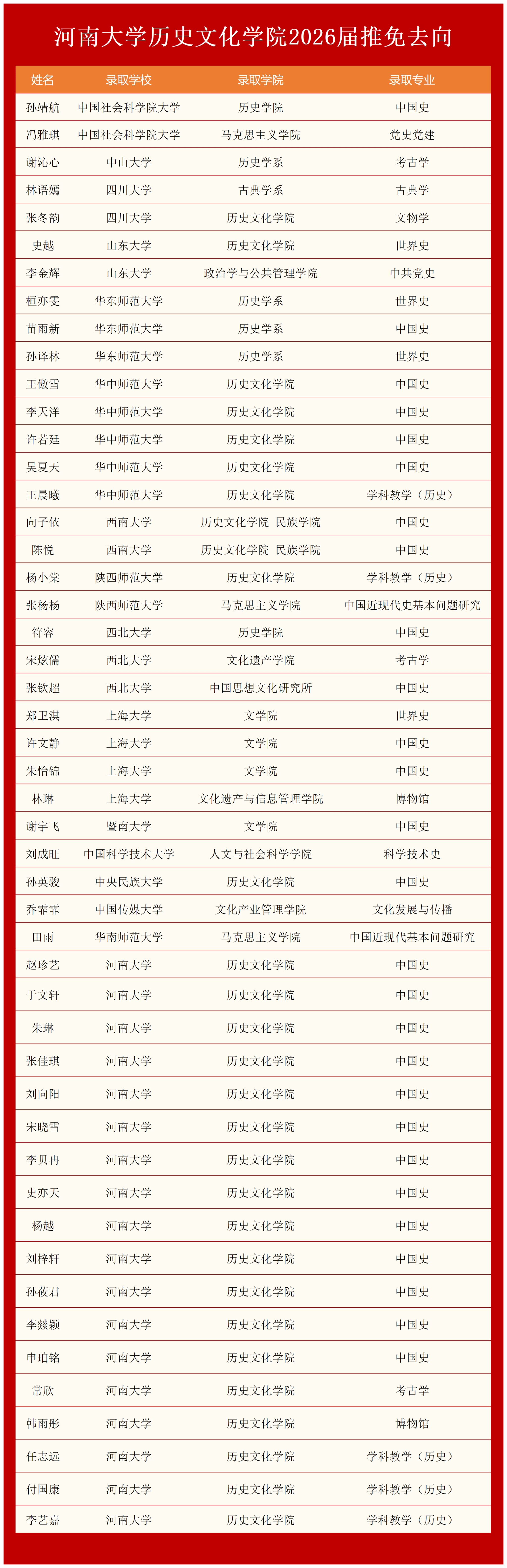 星光不负赶路人,岁月不负有心人。90vs足球比分 50名优秀的本科2026届学子,凭借扎实的学识与不懈的努力,成功推免至中国社会科90vs足球比分 大学、中山大学、四川大学、华东师范大学、华中师范大学等国内知名高校,继续在中国史、世界史、考古学、文物学、博物馆学、学科教学(历史)等专业领域深耕深造。他们即将奔赴大江南北,在更广阔的学术平台上绽放光彩。让我们一起来见证他们的卓越去向!