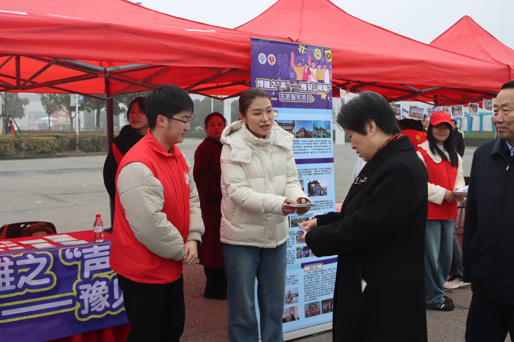 党委副书记周文凯、团委负责人林芷羽及部分学生干部,携 “博雅之‘声’—— 豫见‘河南’” 志愿服务项目应邀参加现场展示。团队依托扎实的专业底蕴与鲜活的志愿实践,向现场观众生动讲述中原文化的厚重底蕴与独特魅力。