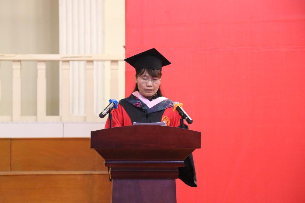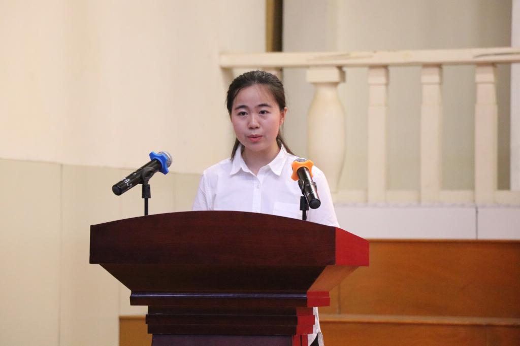 2017级历史学专业朱萌萌同学作为在校生代表发言。她回忆了这几年间与学长学姐们朝夕相处的难忘时刻,对他们无微不至的关怀与指导表示衷心的感谢。她表示,要立志学习学长学姐的优良品行,以他们为榜样,成为优秀的河大学子并祝愿他们前途似锦,万事胜意。