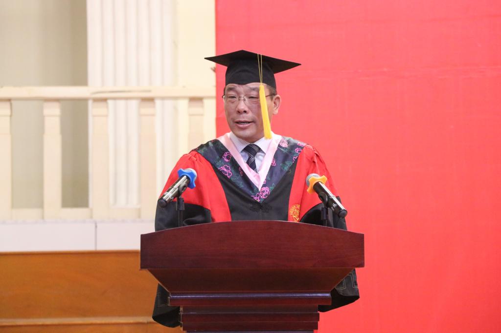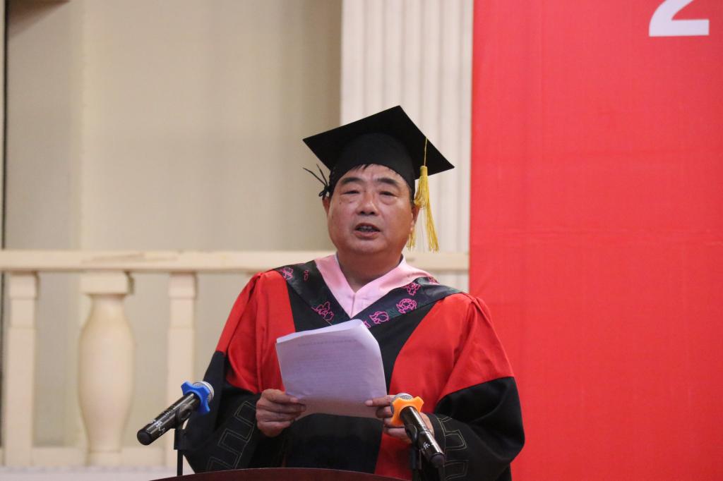 党委书记杨俊中讲话。他指出,四年前同学们带着梦想来到河大,在这一千四百多个日日夜夜里,校园的每一个角落里都留下了同学们奋斗拼搏的身影;如今毕业离校在即,希望同学们在今后的人生历程中坚定目标,不懈努力,对未来充满信心;在遇到难题时保持乐观的心态,积极向上;继续关注和支持母院的发展。最后,他饱含深情地说,母院永远是大家的精神家园,祝愿同学们在未来人生的道路上大放异彩。
