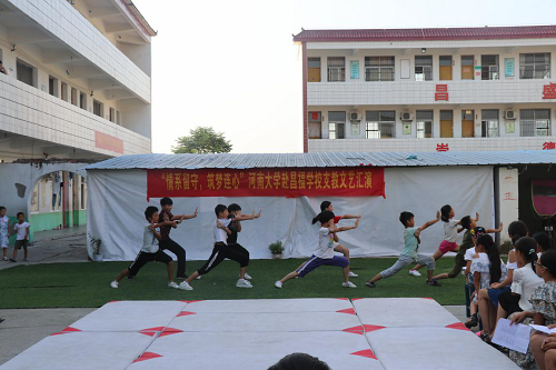 汇演由演讲与口才班选取优秀同学担任主持人,文艺班、体育班、演讲与口才班和武术班均有节目展示。汇演伊始,青春活力的开场舞《咖喱咖喱》使现场气氛活跃起来,然后昌福学校校长进行致辞,表达了对于河南大学支教团的感谢,紧接着节目各类节目轮番登场,异彩纷呈。文艺班带来的歌曲《成都》悠扬动听小虎队的《爱》青春怀旧;演讲与口才班的朗诵《水调歌头》声情并茂,《理想》铿锵有力,抑扬顿挫;体育班展示了一场行云流水的太极拳表演和一首嘹亮热血的《强军战歌》;武术班则呈现了一场精彩绝伦的《少林英雄》,现场气氛达到顶峰。最后,支教团队长代表支教团发表感言,感谢十五天以来学校老师的照顾,希望孩子们在今后的学习生活里能够不断进步,未来越来越美好。在一片掌声中,文艺汇演落下了帷幕。