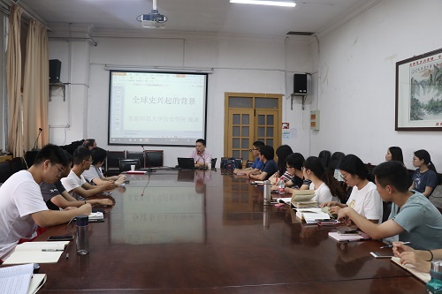 闫照祥教授首先介绍了施诚教授以及最近首师大与河大之间学术交流的渊源,对施诚教授的到来表示欢迎。讲座伊始,施诚教授阐述了美、德等国家的学者对“全球史”这一概念的不同解读,并对“跨文化”一一词进行了详细介绍,强调了跨文化互动对全球史发展产生影响。他指出,世界史作为一个新兴教研和研究领域产生的标志主要包括以下三个方面∶1963年威廉·H·麦克尼尔出版《西方的兴起--人类共同体的历史》;1982年美国世界历史学会成立;1990年《世界历史杂志》创办。施诚教授还分析了全球史和世界史的区别∶全球史讲究跨文化互动,侧重于横向发展,站在不同的角度看问题,而世界史侧重于纵向发展。随后,施诚教授详细介绍了全球史兴起的背景主要有三个方面,一是全球化的兴起,他介绍了学术界不同学者从经济、文化、政治不同角度对全球化起点的界定及阶段划分。二是学术背景,即西方的世界史编撰系统、战后美国的地区研究和联合国教科文组织编写《人类史》;三是美国世界史教学历程与全球史的兴起。