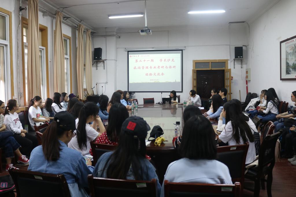 三楼会议室成功举办。本期活动主题为旅游管理专业考研与保研经验交流会,由16级旅游管理专业张寅颖同学主持,邀请了张野和王忠丽老师以及五位大四考研和保研的同学,为16、17级旅游管理和文化产业管理专业的30余名本科生分享了经验。