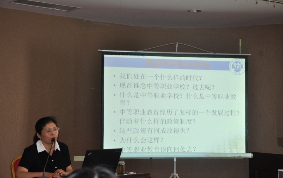 教授王星霞老师以《透视中职教育》为题,借助中等职业教育发展政策变化列表,串讲了改革开放以来中职教育的发展历程,并对国家中长期职业教育的核心——培养什么人,怎么培养人等重大问题展开了讨论。