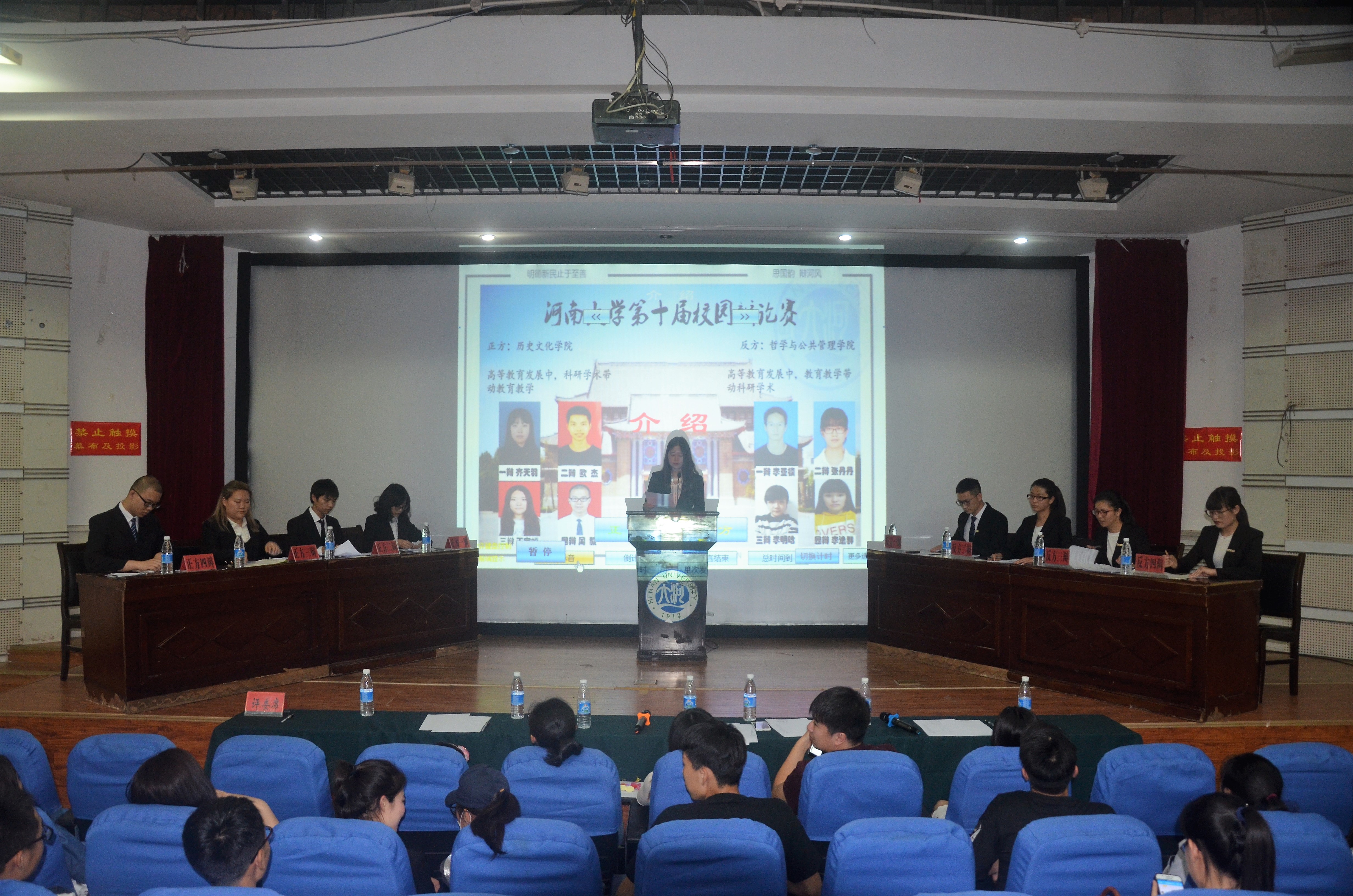 辩论队之间展开,双方围绕高等教育发展中,科研学术带动教育教学还是教育教学带动科研学术展开了激烈的辩论。比赛开始前,主席介绍了比赛规则以及注意事项,并演示了比赛中的提示音。