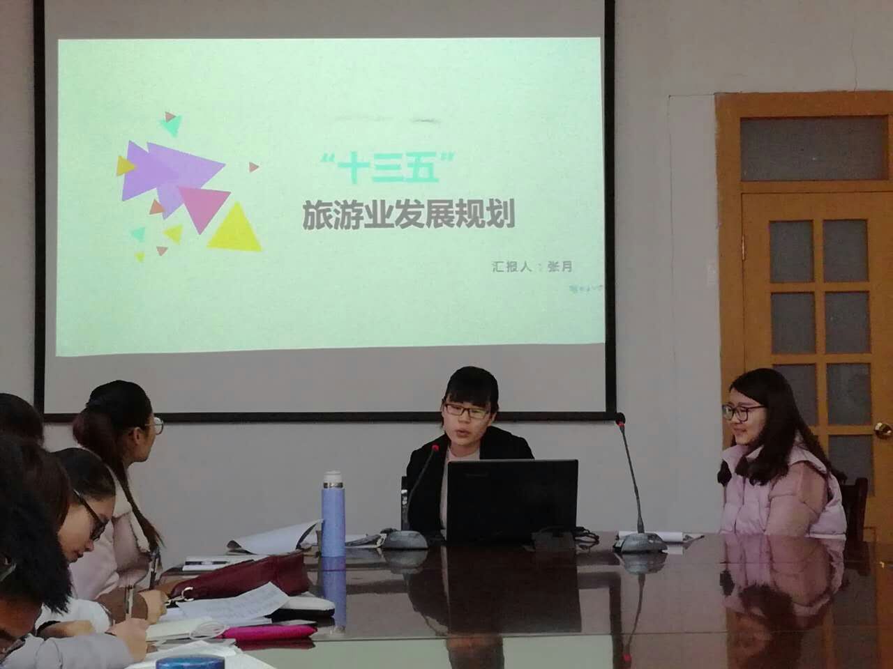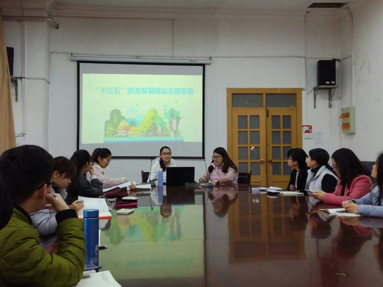 第一部分是旅游新闻播报环节,沈联衢重点介绍了关于澳大利亚2017“中澳旅游年”和我国“第三卫生间”的业界新闻。第二部分是由15级旅游管理专业黄悦与杨安瑞两位同学解读国家“十三五”旅游发展规划,她们介绍了“十三五”旅游发展规划的内容、趋势、目标,旅游产品的创新,旅游开放新格局,分析了“十三五”规划的十大看点,并提出了一些思考与建议。之后,16级旅游管理研究生张孟梦对旅游发展的新业态予以讲解,着重分析了养生旅游、研学旅游、自驾车旅游和低空旅游。接下来,16级旅游管理研究生张月对“十三五”旅游规划的五大趋势做了分析,简要介绍了开封“十三五”旅游发展规划的内容。