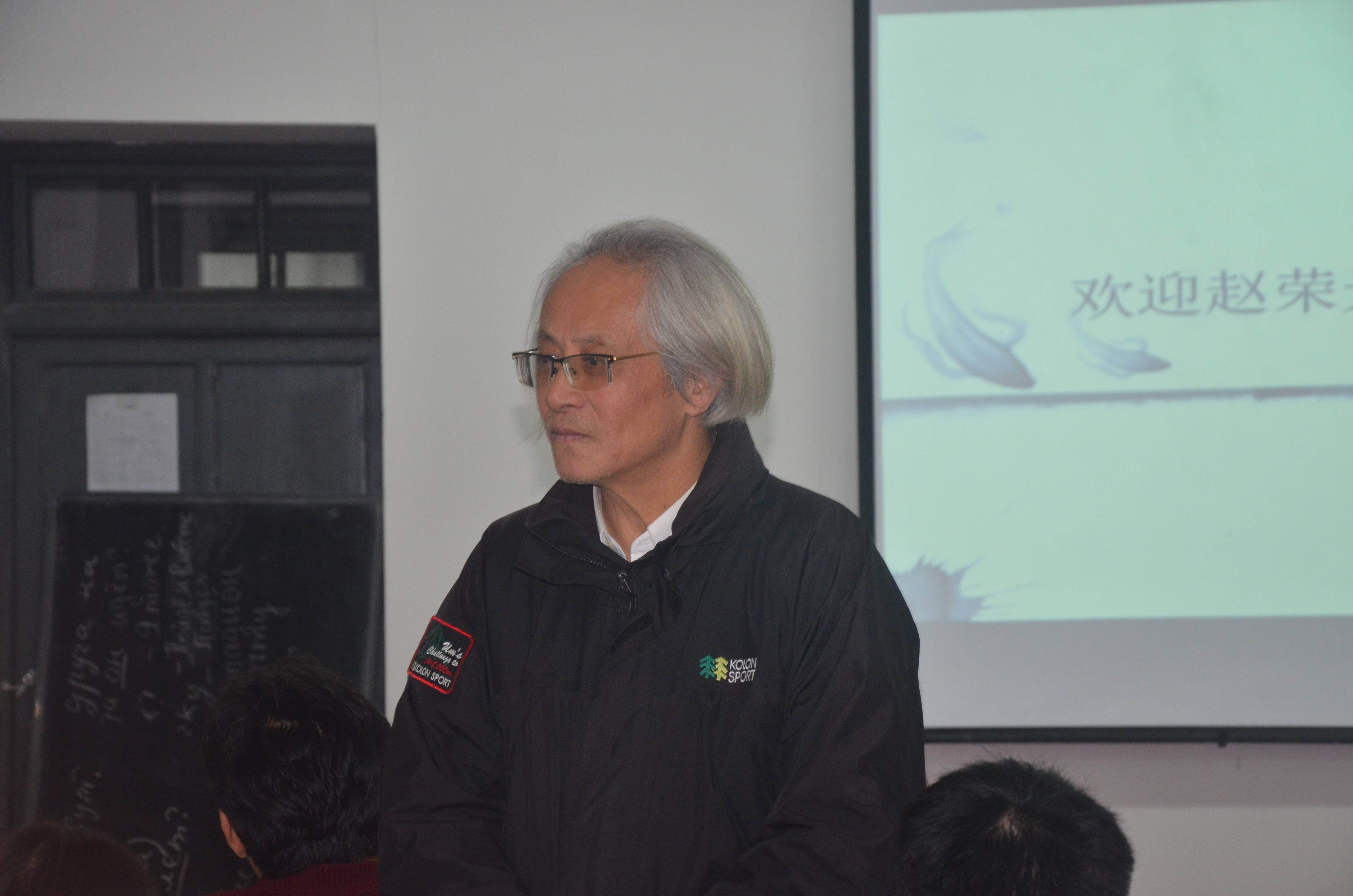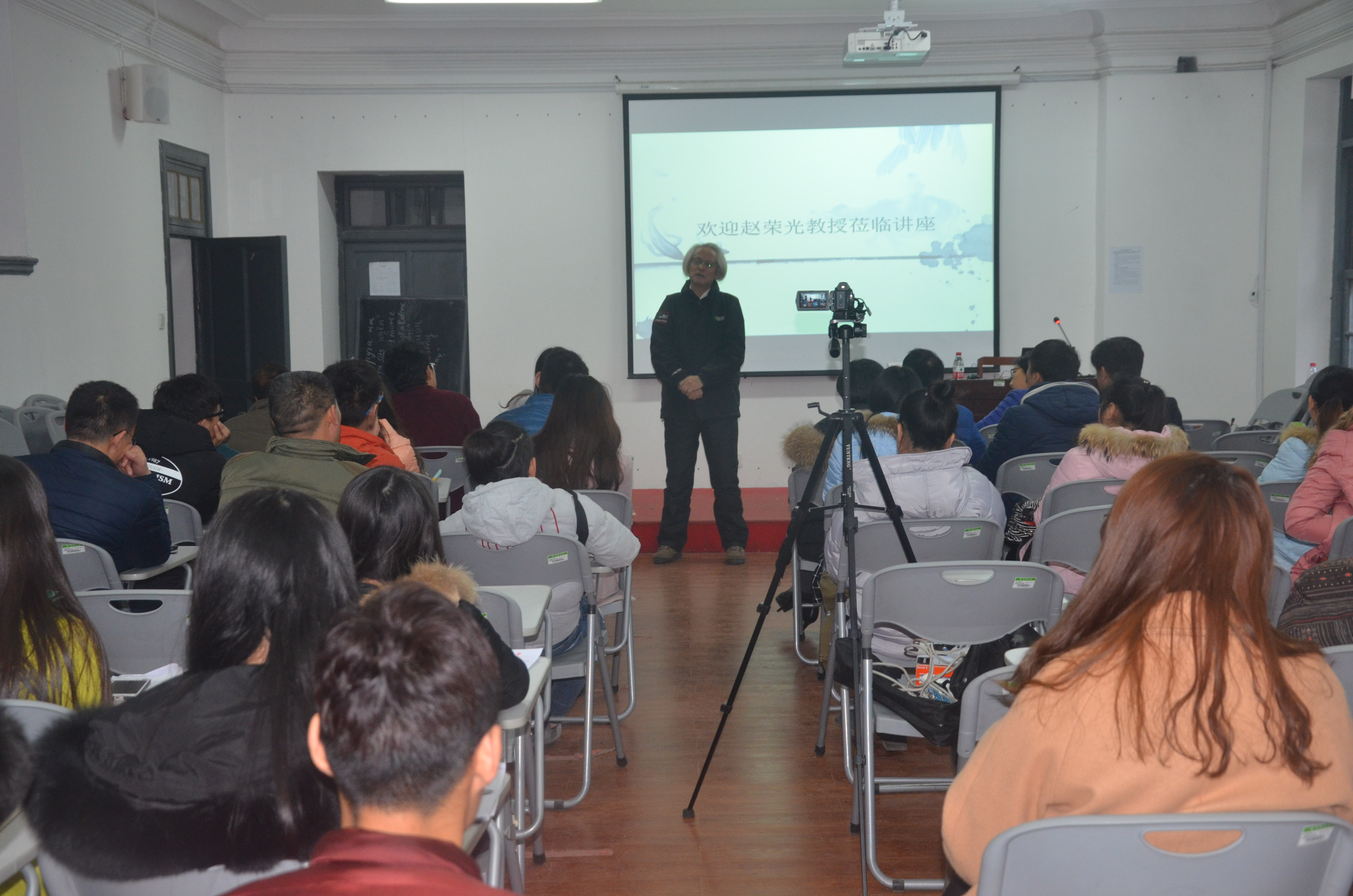 一楼107教室气氛热烈、座无虚席。来自浙江工商大学中国饮食文化研究所的赵荣光教授应邀在此作了一场题为“丝绸之路上与中外饮食文化交流”的讲座。讲座由酒店管理教研室主任宋军令副教授主持。