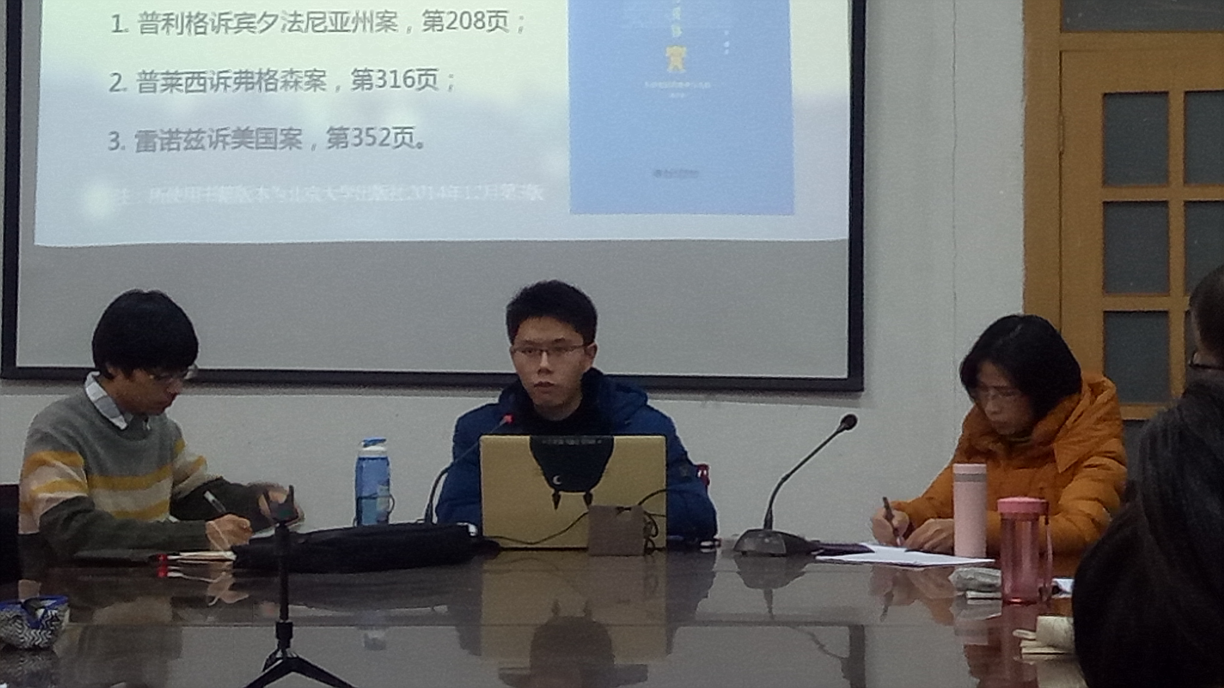 宋睿芃首先从写作该论文的背景讲起,一本关于美国种族隔离制度的书——《原则与妥协》给予他很大启发。他从美国种族隔绝制度的背景出发,详细介绍了几种公民参与案典例。有趣的是,这几个都是公民有预谋、有目的的利用实验案来逼迫法院对社会敏感问题做出回应,并在法律上形成典范和先例的案例。宋睿芃以案例中的公民参与为本,总结了所提案例的特点,并提出自己的问题。
