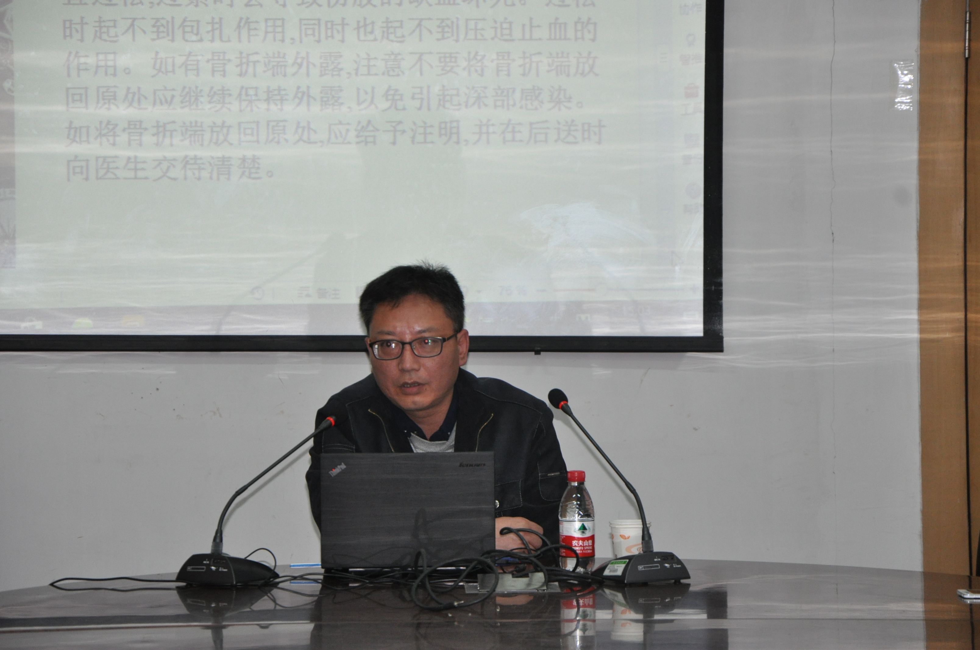 王晖以现阶段大学生急救技能掌握的重要性为引,开始第二期急救培训的理论指导,他从症状识别、原因分析、高发人群、急救方法四个角度,详细解说了气道异物梗阻、创伤止血、溺水、中暑、骨折等情况下急救方法的注意事项。他特别提到,针对不同受伤群体应采取不同的应对方法,并对现场急救的一般原则进行了简单总结。