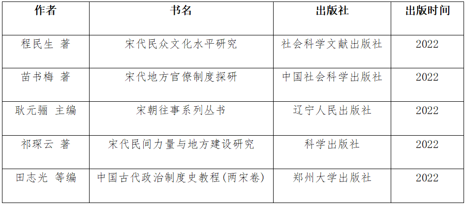 近期,河南大学宋史研究团队程民生、苗书梅、耿元骊、祁琛云、田志光等学者的研究成果相继出版。这些成果以专题研究著作为主,兼顾史学普及和教材建设,内容涉及宋代政治史、制度史、社会文化及地方建设等多个领域,进一步展示了宋代多个历史图景。五部著作的相继出版,体现了河南大学宋史研究团队迸发的学术活力,是近年来宋史团队在国家社科基金项目研究等方面的成果展示。