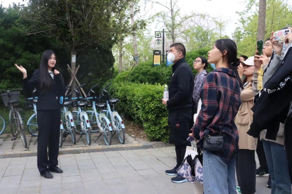 导游部讲解员的脚步,踏上了探寻河大百年历史的旅程。讲解员们神采奕奕,滔滔不绝,带领大家从气势宏伟的南大门出发,踏上博雅路,途径美不胜收、古朴典雅的河南大学近代建筑群,并在庄重的大礼堂前合影留念。随后,大家继续参观设计精巧、端庄厚重的校史馆与馆藏丰富的文物馆,了解古典美丽的河大校园与其背后所积淀的深厚文化底蕴。一路上,讲解员的讲解伴随着欢快的鸟鸣声声入耳,生机勃勃的自然景色和设计精巧的建筑群相得益彰,大家与春风撞个满怀,与铁塔相望,宴游河大。